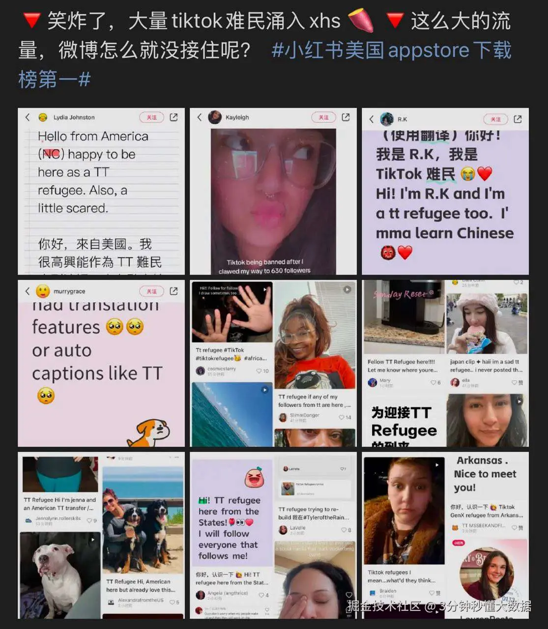由于 TikTok 在美国即将面临禁令,许多美国用户为了避免 Tiktok 被封掉导致账户无法使用,因此他们转向了其他中国社交媒体平台,如小红书, 同时自称为:TikTok Refugee ~