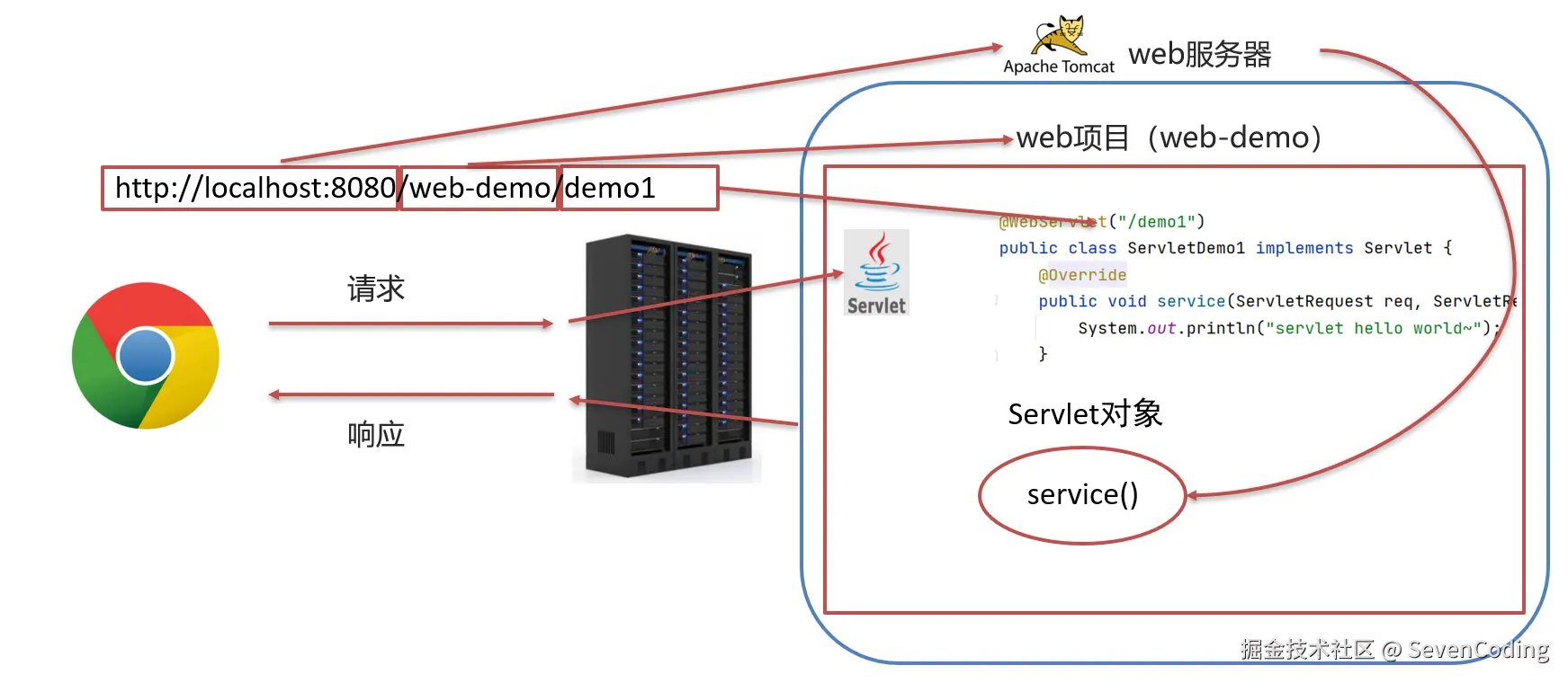 浏览器发出 http://localhost:8080/web-demo/demo1 请求,从请求中可以解析出三部分内容,分别是localhost:8080、web-demo、demo1: