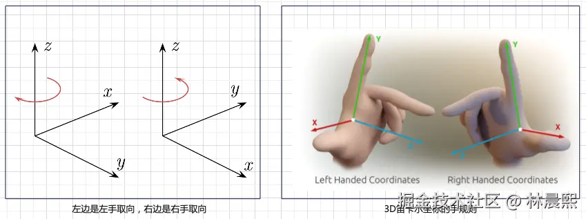 在三维空间中确定了X轴、Y轴位置方向的同时,根据Z轴正方向的不同分为左手坐标系和右手坐标系。