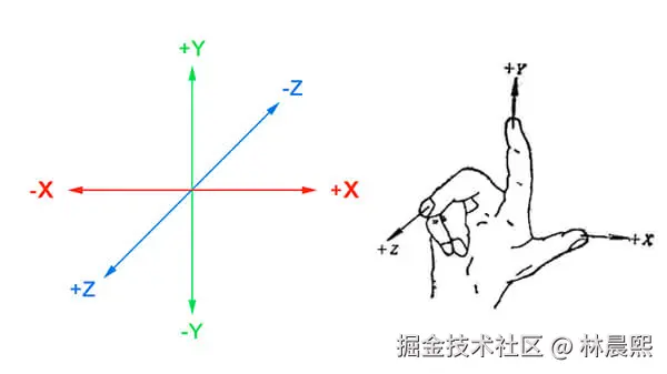 - 在右手坐标系中,x、y、z 三个轴按照右手定则排列。