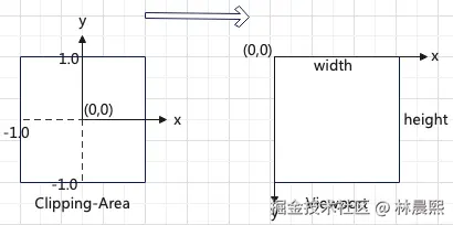 默认情况下,裁剪区域是一个以原点为中心的 2x2 的正方形(XY平面,Z 轴主要用于深度缓冲区和绘制顺序,不直接影响屏幕坐标的平面映射),其坐标范围是从 (-1, -1) 到 (1, 1)。