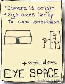 - 相机坐标系以相机为原点,提供了一种简单的方式来定义“从相机(模拟人眼)看到的世界”: