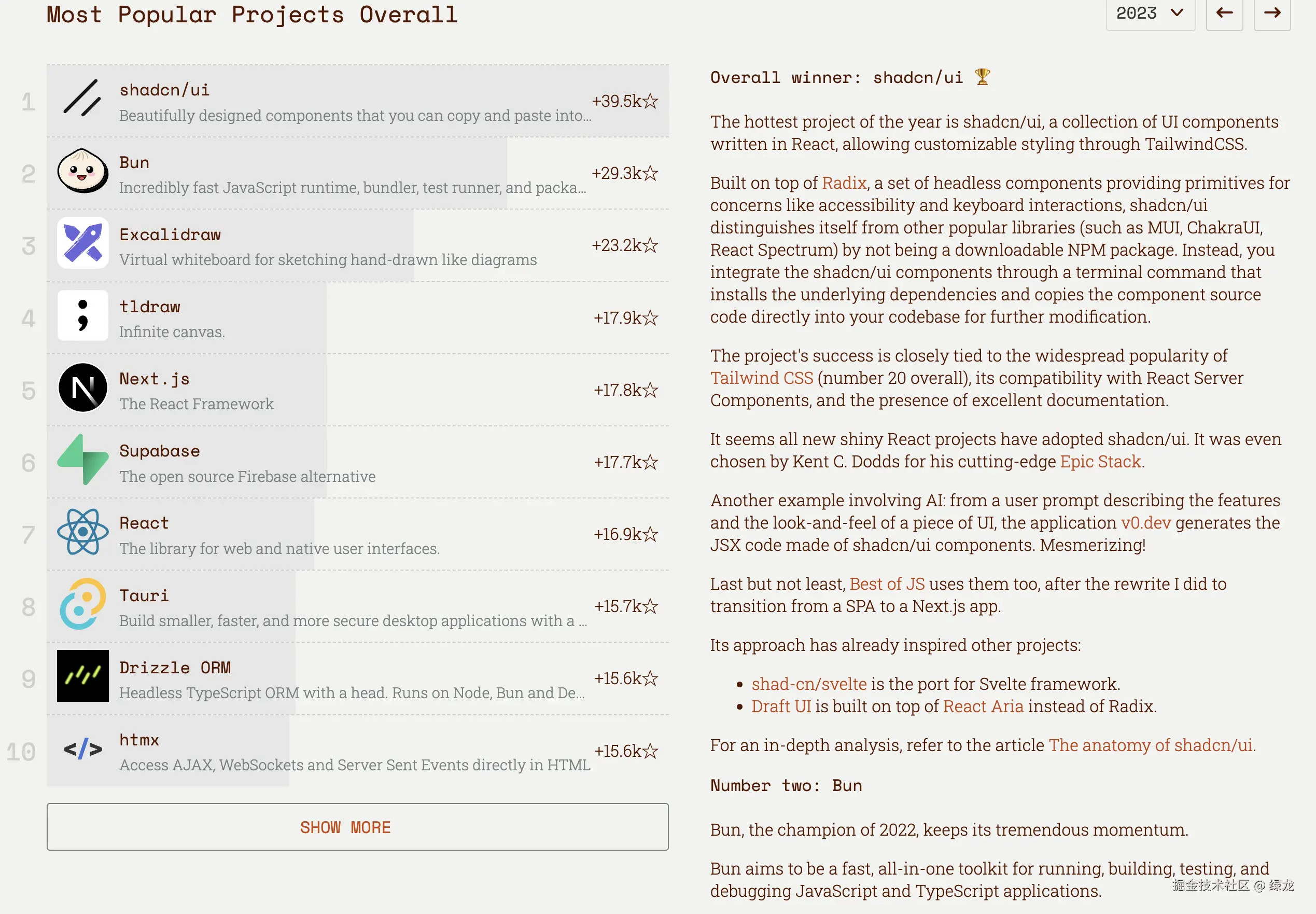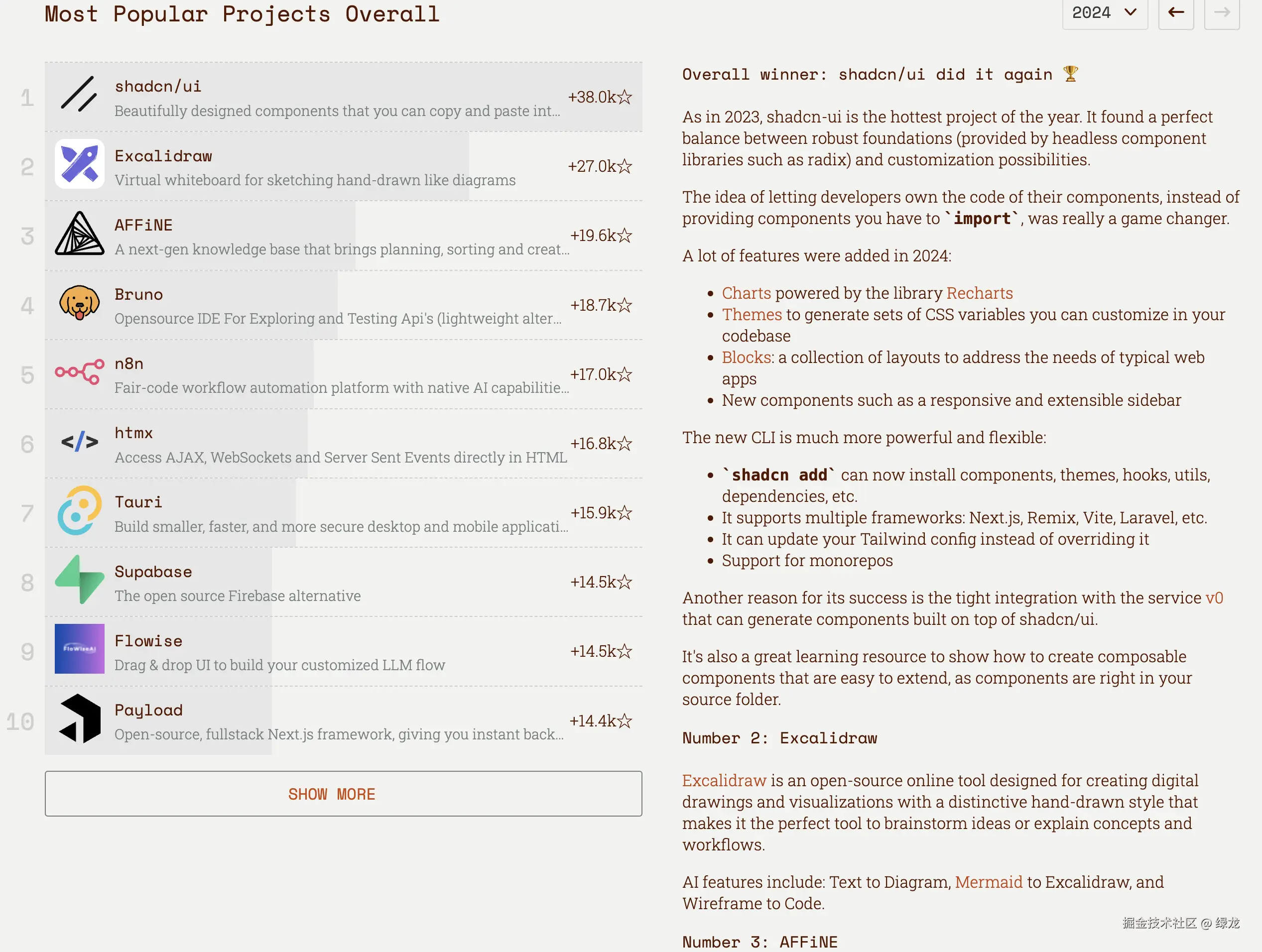在 Best Of JS 的最受欢迎项目(Most Popular Projects Overall)中,shadcn 更是连续两年(2023、2024)拿下第一名。(题外话:上一次做到这一成就的是 Vue2,2016-2019 连续四年占据榜首)
