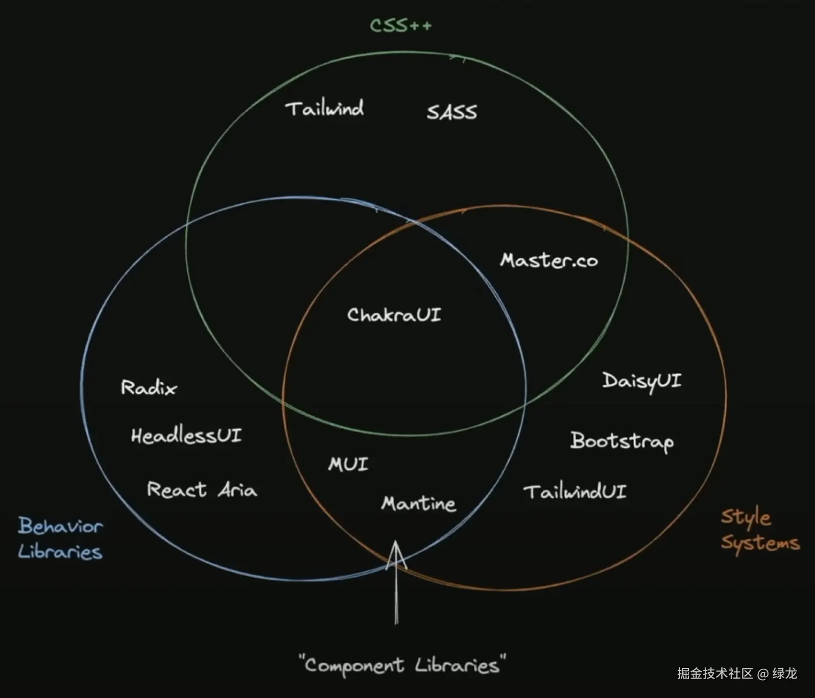 - 中间的 Chakra UI 同时涵盖了 behavior、style 和 css 工程化方案,提供了更均衡的体验,这部分我会在下期详细介绍