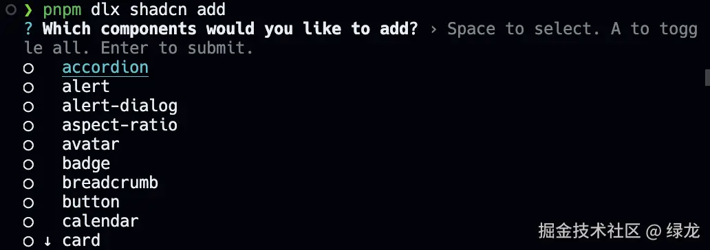 相比于传统的组件库,shadcn 的组件不是通过安装 npm 包使用,而是通过 CLI 进行安装: