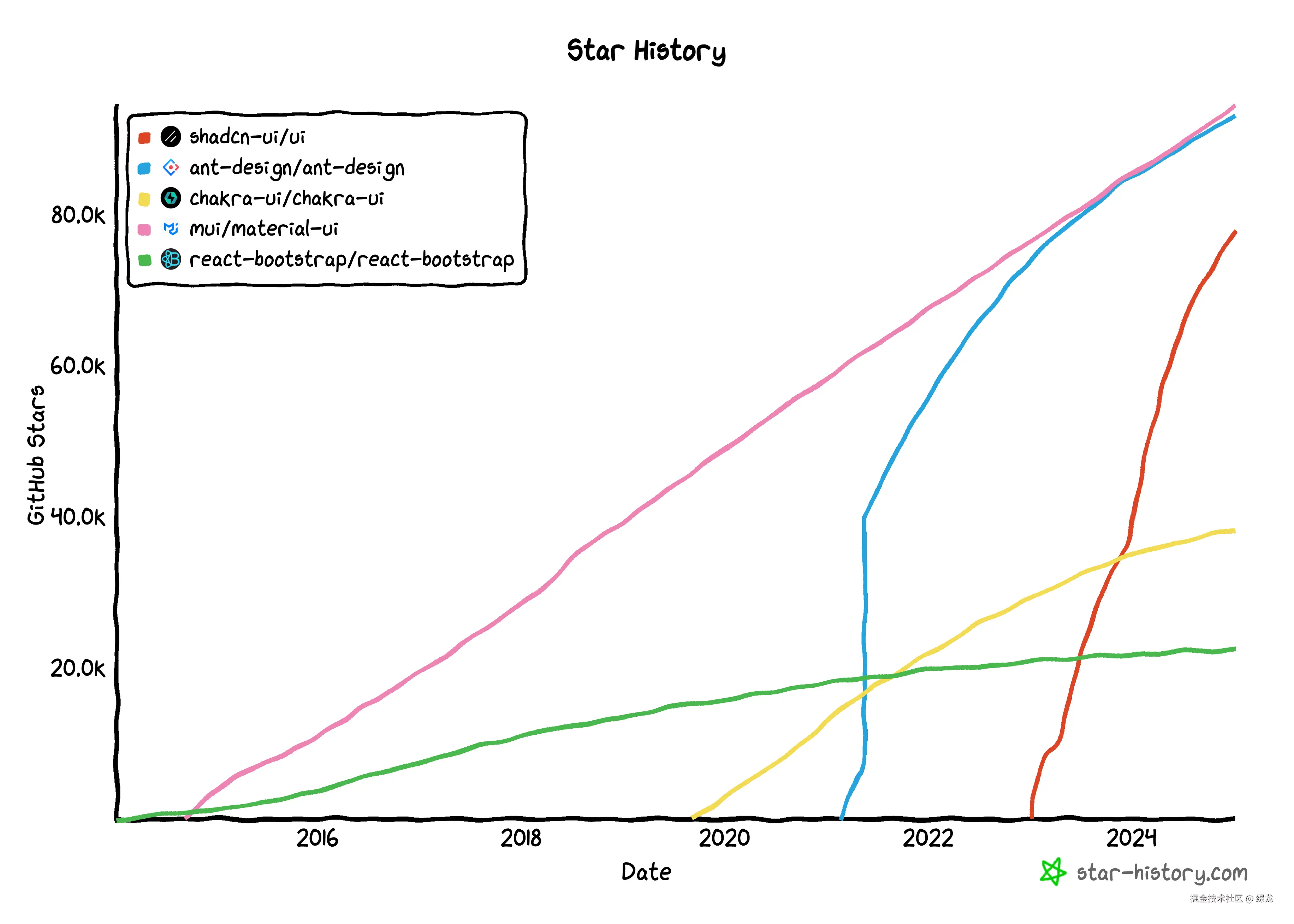 从下方的 Star History 可以清晰地看出,shadcn 的受欢迎程度有多么高,超过老大哥 MUI 和 antd 成为最流行的组件库似乎只是时间问题: