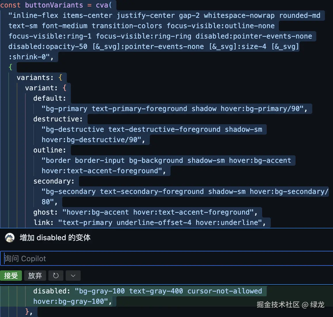 我们注意到组件通过 cva 库声明了 button 的变体属性 buttonVariants,包含变体: