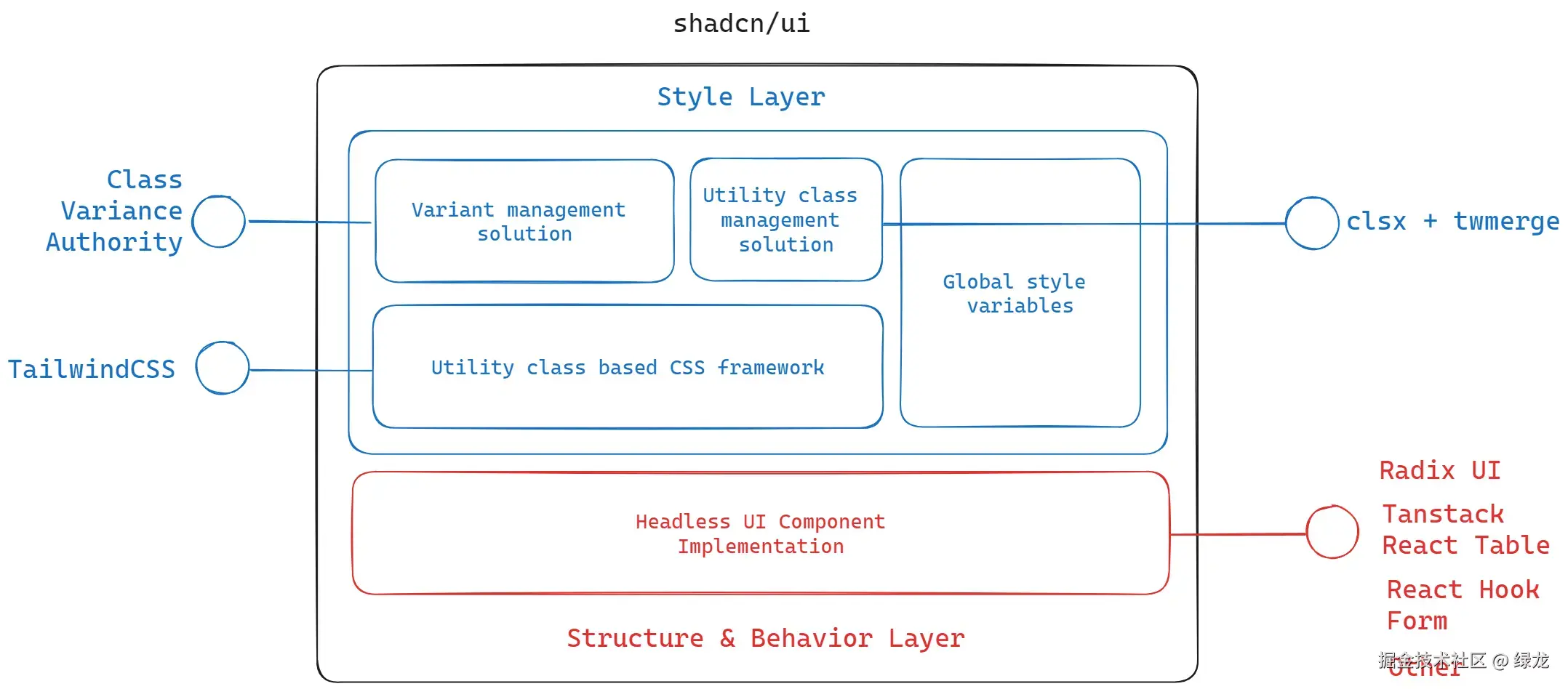 - Structure & Behavior Layer:shadcn 所依赖的一系列无头组件库,大部分组件基于 Radix UI 进行封装,但 Table、Form、Date Pickers 等少数组件基于其他库进行开发