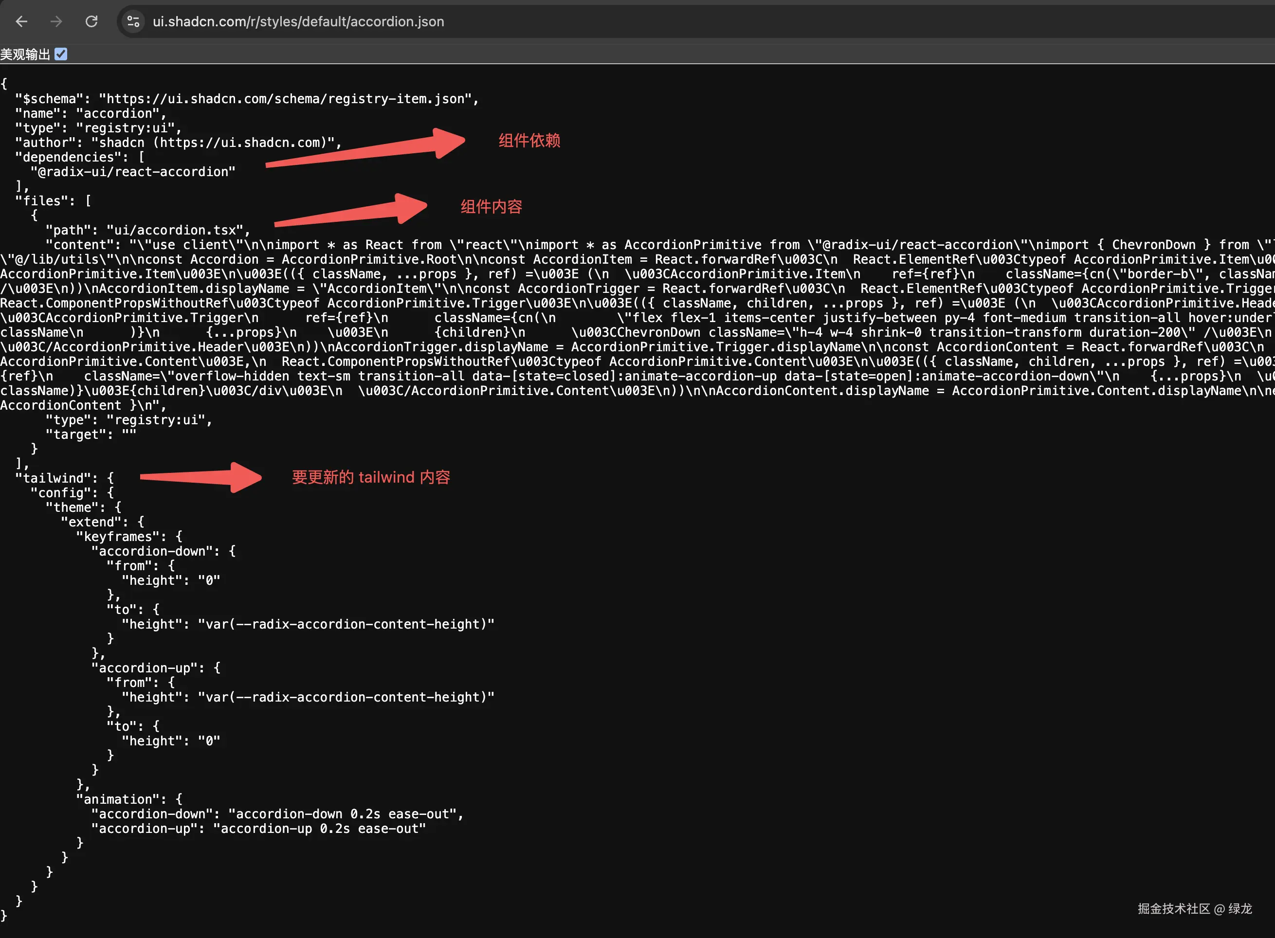当我们使用 shadcn 安装组件时,实际上就是从官方 registry 中安装组件(以 accordion 为例):
