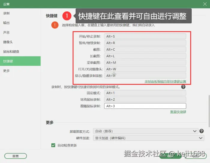尤为值得一提的是,用户可以自定义Win10录制屏幕快捷键,软件原定的录制快捷键是 【Alt+S】 。而我们可以根据使用习惯自定义录制快捷键,从而提高录制效率。