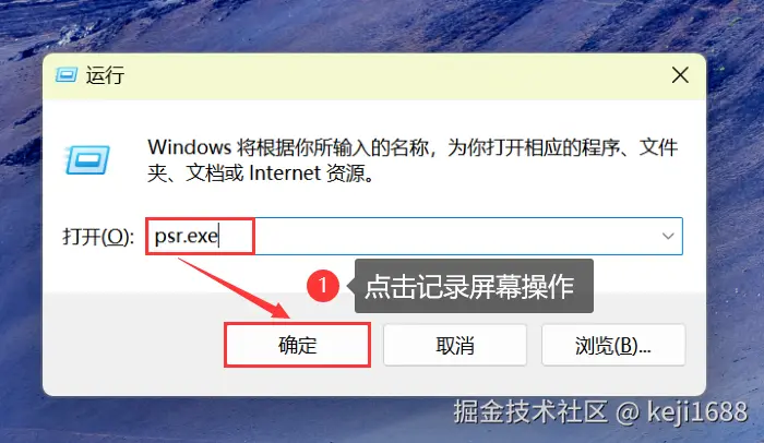 步骤1:按下 【Win+R】 组合键,打开运行窗口,输入【psr.exe】命令,点击 【确定】 按钮。