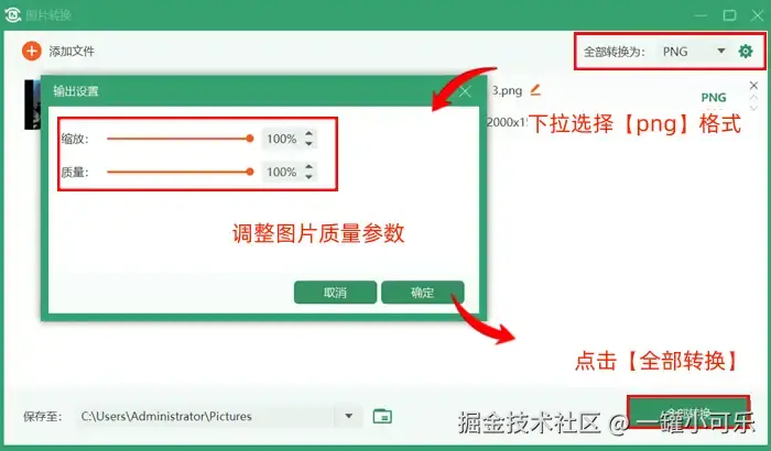 第三步:点击转换界面右上角的格式选择项,下拉选择【png】格式,然后点击设置标志,调整图片质量参数,最后点击【全部转换】。