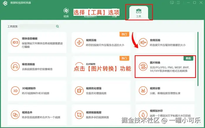 第一步:运行数据 蛙视频转换器,选择【工具】选项,点击工具界面下的【图片转换】功能。