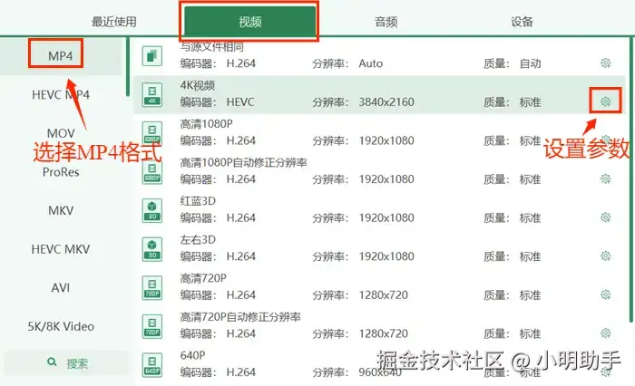 第三步:进入该界面后,点击上方的【视频】按钮,选择自己需要的【MP4】格式。也可以选择点击界面右侧的小齿轮按钮,新建一个调整成自己所需参数的MP4格式并进行选择。