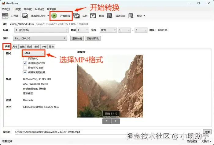 第二步:在【摘要】界面选择MP4格式,然后点击软件界面上方的【开始编码】按钮开始转换视频格式。