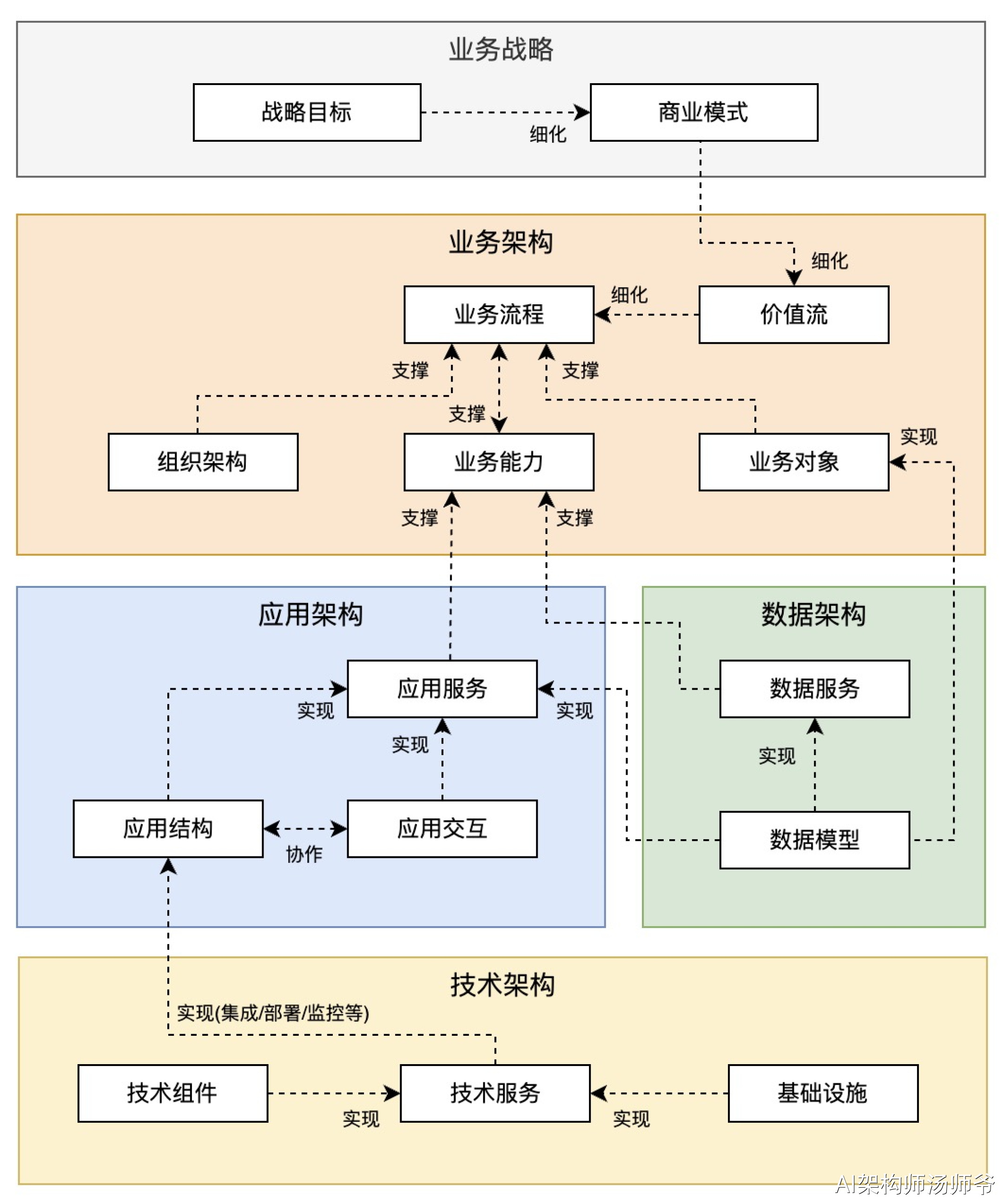 明确业务战略后,接下来要构建完整的架构蓝图,蓝图包括业务架构、应用架构、数据架构和技术架构这4类架构视图。