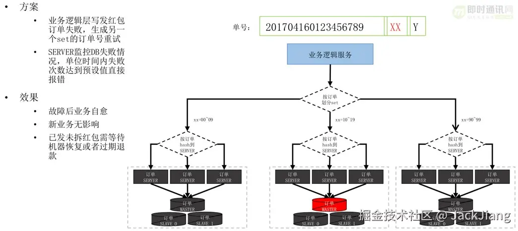 也就是在发生故障时,业务逻辑层发布一个版本,屏蔽故障号段的单号生成,就可以恢复业务。进一步想,除了人为发版本,有没有方法可以让 DB 故障时自动恢复?在 DB 故障导致业务失败时,业务逻辑层可获取到故障 DB 的号段,在发红包时,将这些故障的号段,换一个可用的号段就可恢复业务。订单号除了最后三位,前面的部分已能保证该红包唯一性,后面的数字只代表着分库表信息,故障时只需要将最后三位换另外一个 SET 便可自动恢复。