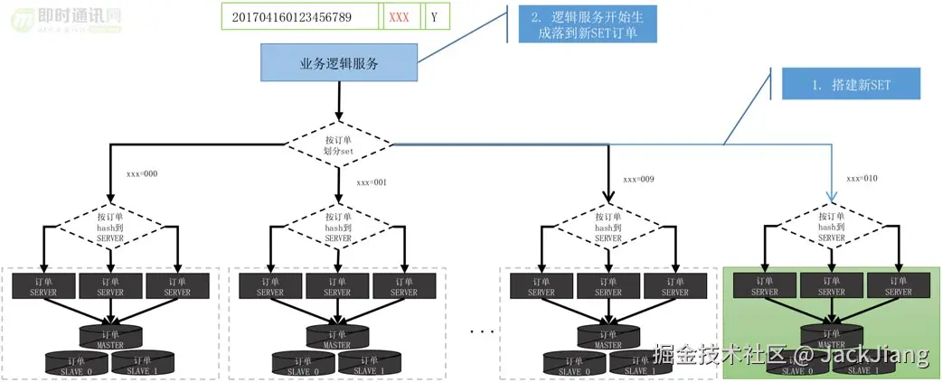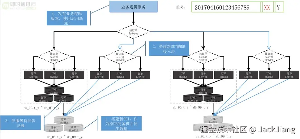 这个扩容方式的复杂性,根本原因是数据需要从旧 SET 迁到新 SET。如果新产生数据与旧数据没关系,那么就可以省掉这部分的迁移动作,不需停服输。分析发现,需要把旧数据迁出来的原因是订单号段 00-99 已全部被用,每个物理数据库包含了 10 个逻辑库。如果将订单号重新设计,预留三位空间,三位数字每一个代表独立的物理 DB,原来 10 组 DB 分别为 000-009 号段。