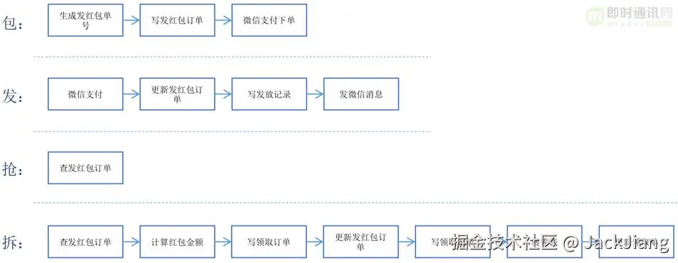 上图是微信红包系统角度上的流程,业务主流程是包、发、抢、拆四个操作,每个操作包括几个关键步骤。