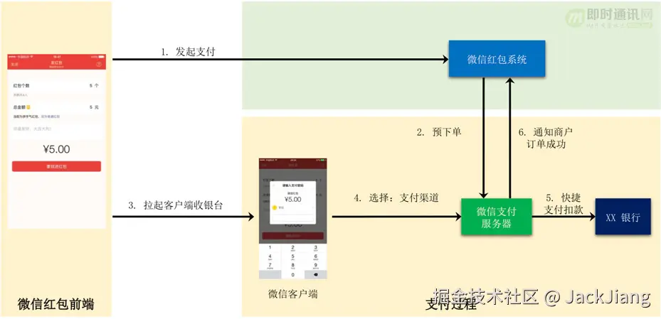 微信红包和微信支付之间的交互,与普通商家与微信支付的交互一样,需要经过六个步骤。用户发红包时,进入微信红包下一笔订单,系统记录发红包用户、发红包金额、红包数量和要发送到的用微信群。然后微信红包系统请求微信支付服务器进行下单,用户使用微信支付进行支付。