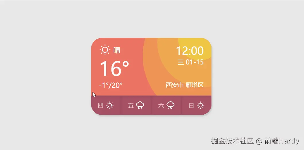 这段代码是一个 HTML 页面,它包含了 CSS 样式,用于创建一个天气信息卡片。这个卡片显示了当前的天气状况、温度、时间和未来几天的天气预报。