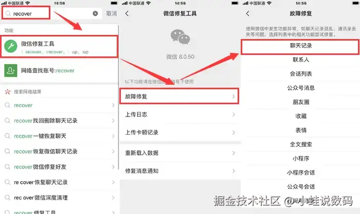 恢复步骤:在微信的主页的搜索栏中输入并搜索 【recover】 ,在弹出的页面里点击 【故障修复】 选项并选择 【聊天记录】 进行修复。