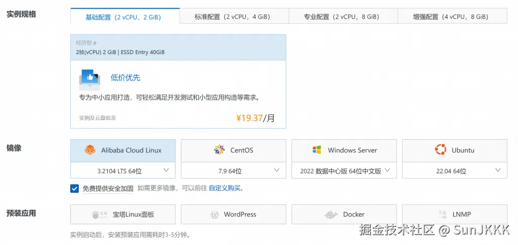 配置选择如图所示,选择基础配置(2核(vCPU) 2 GiB | ESSD Entry 40GiB)即可,价格为99元/年,此处因作者已经购买过了,所以价格不是99元/年。镜像推荐选择Alibaba Cloud Linux 3.2104 LTS 64位,预装应用不选择。因为后续通过一键部署脚本进行部署有镜像系统版本要求,所以此处不要选择错误。