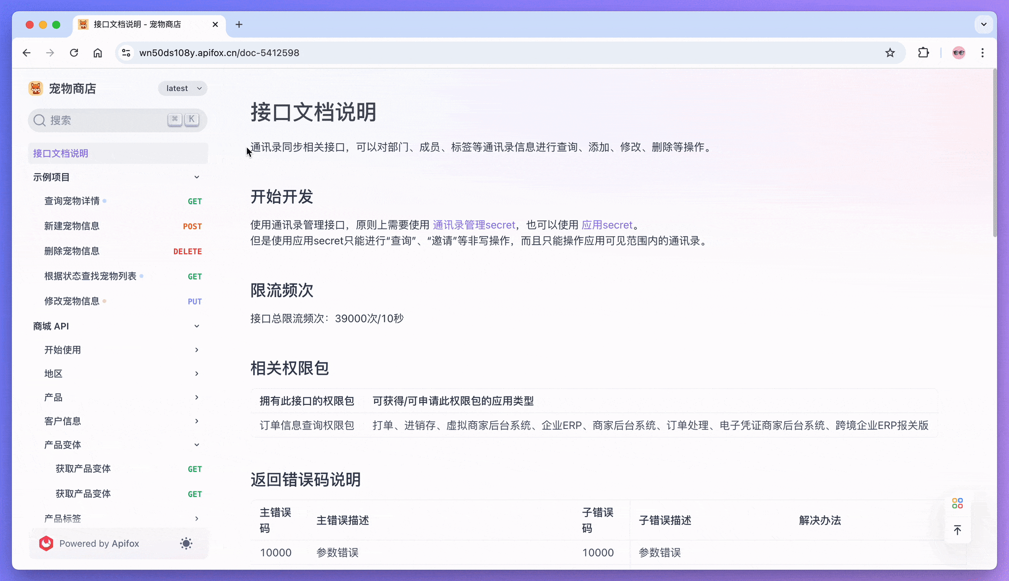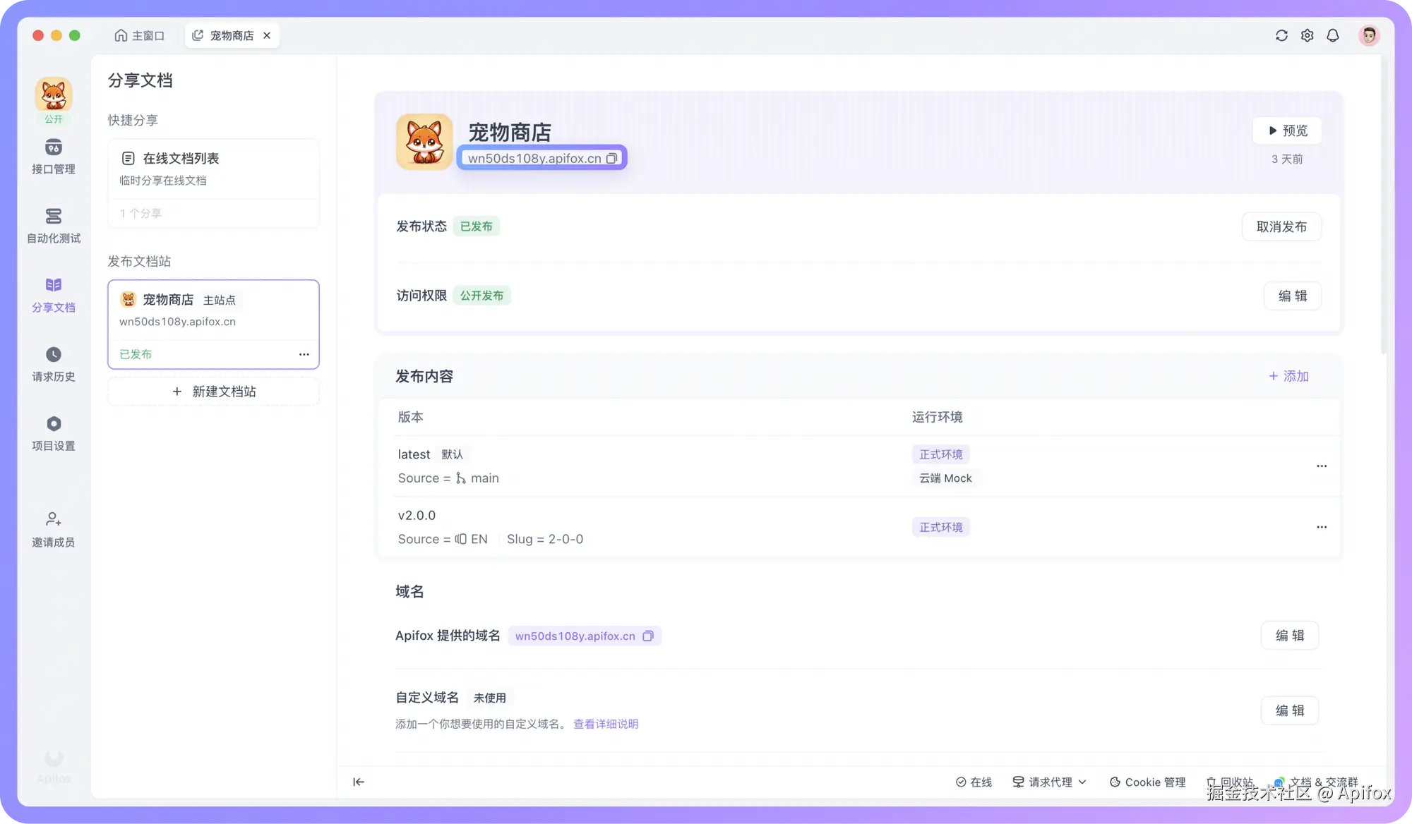 文档站的 URL 就是 Apifox 提供的默认二级域名。