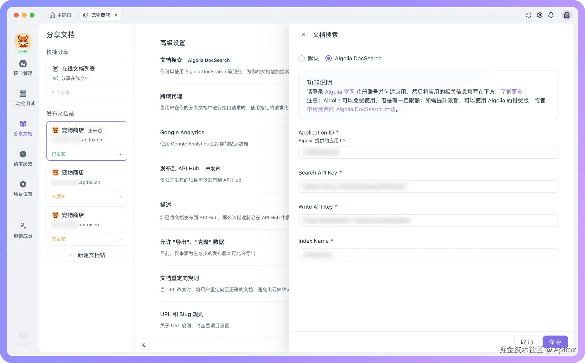 在 Apifox 中进入你的项目,找到已发布的「文档站」,在文档站的高级设置中,找到「文档搜索」选项,将 Algolia 提供的 Application ID、 Search API Key、Write API Key 和 Index Name 填入相应的输入框中。