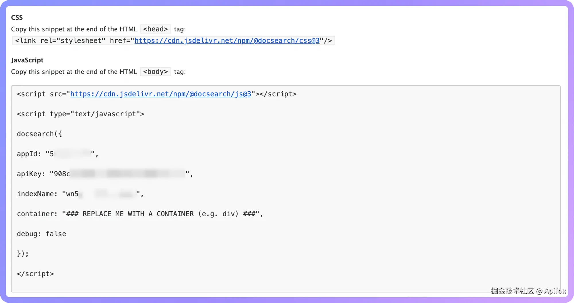 要将 Algolia 搜索服务集成到 Apifox,需要获取 Application ID、 Search API Key、Write API Key 和 Index Name,这些信息会在后续的配置中使用。
