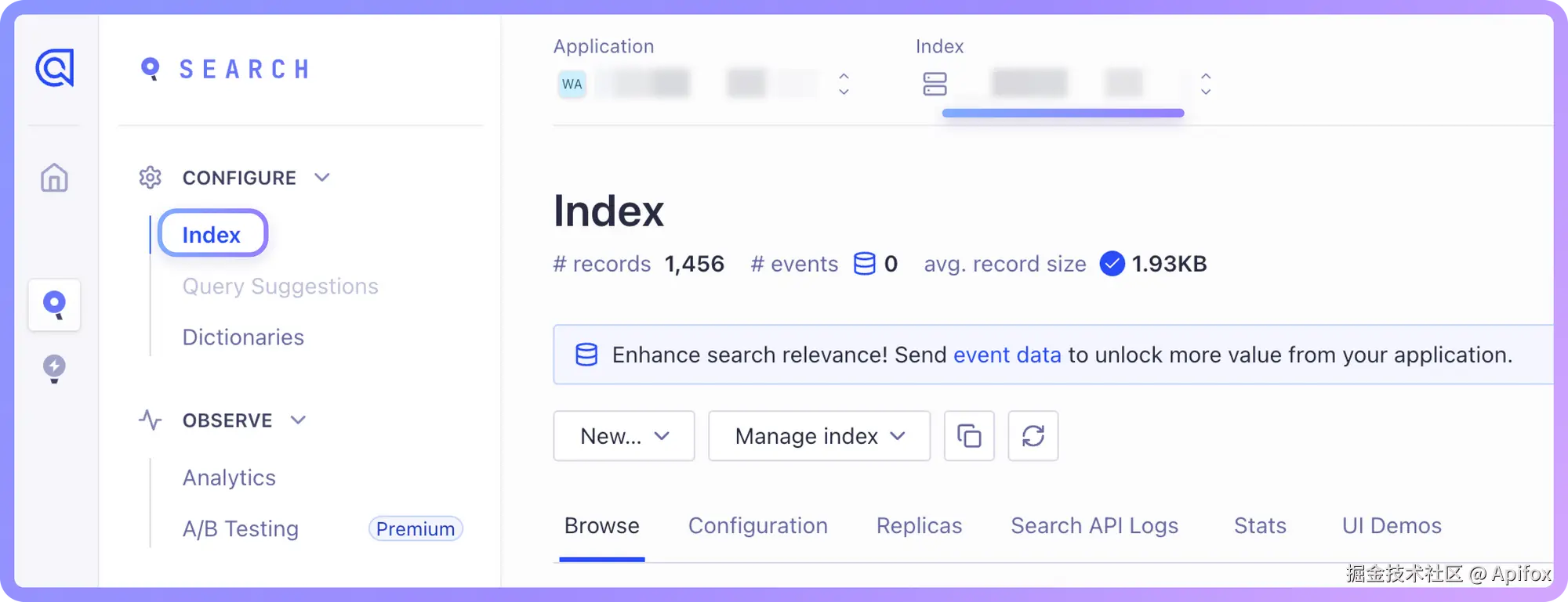 在 Algolia 后台的 Search 页面中,找到你的文档站对应的索引名称 (Index Name) ,这个值也需要填入 Apifox 的配置项中。