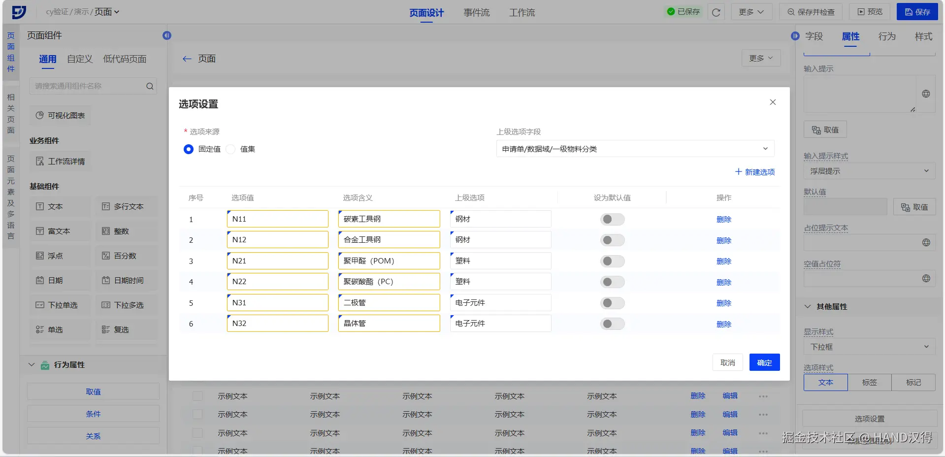 除了在创建业务对象时可以直接配置字段的上级选项,页面设计中选项类虚拟字段的选项设置里也支持上级选项的配置,用来建立与其他页面字段的级联关系。