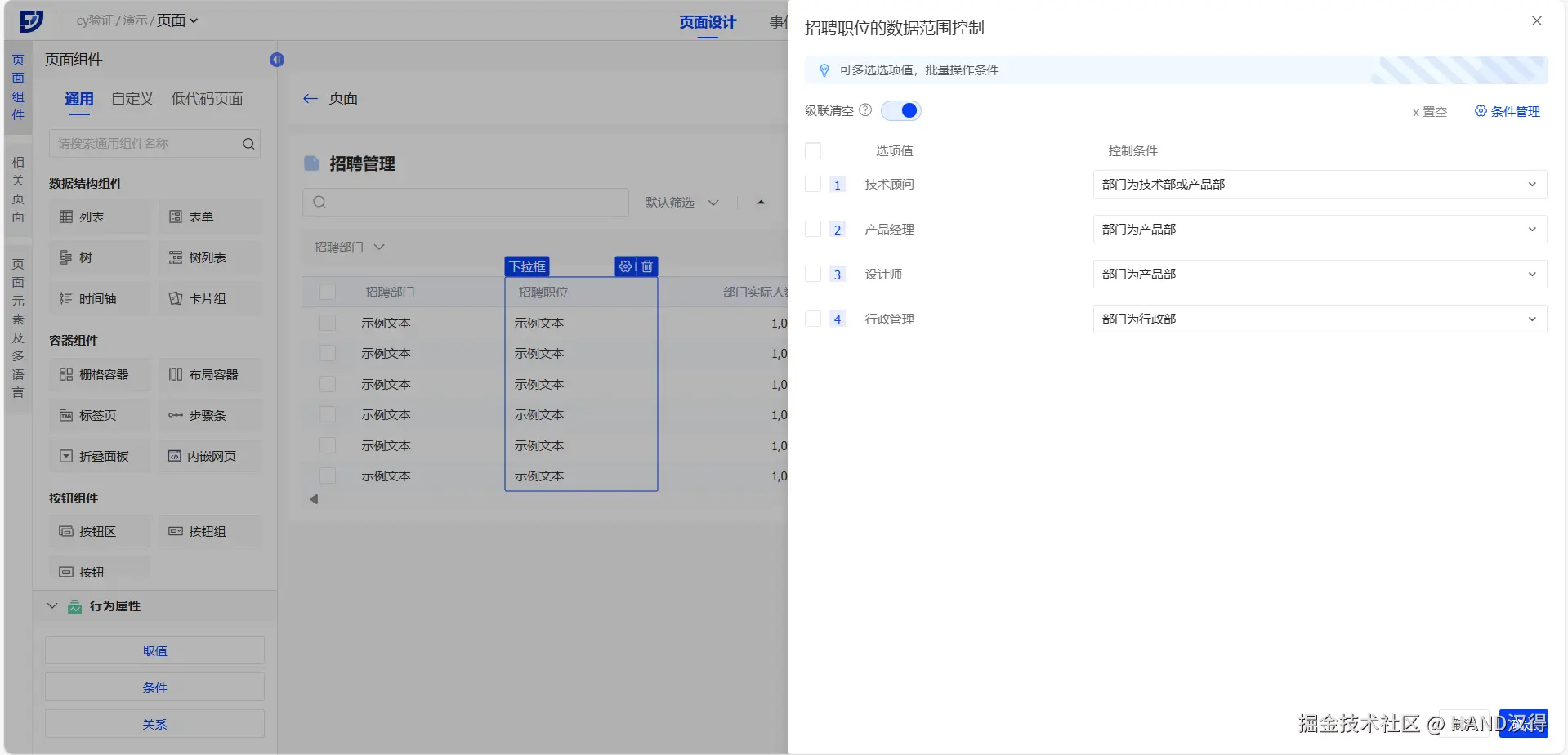 以 《飞搭系列 | 数据范围控制助力实现级联选择、数据过滤经典场景》 中提到的招聘场景为例,部门和职位之间存在级联选择。