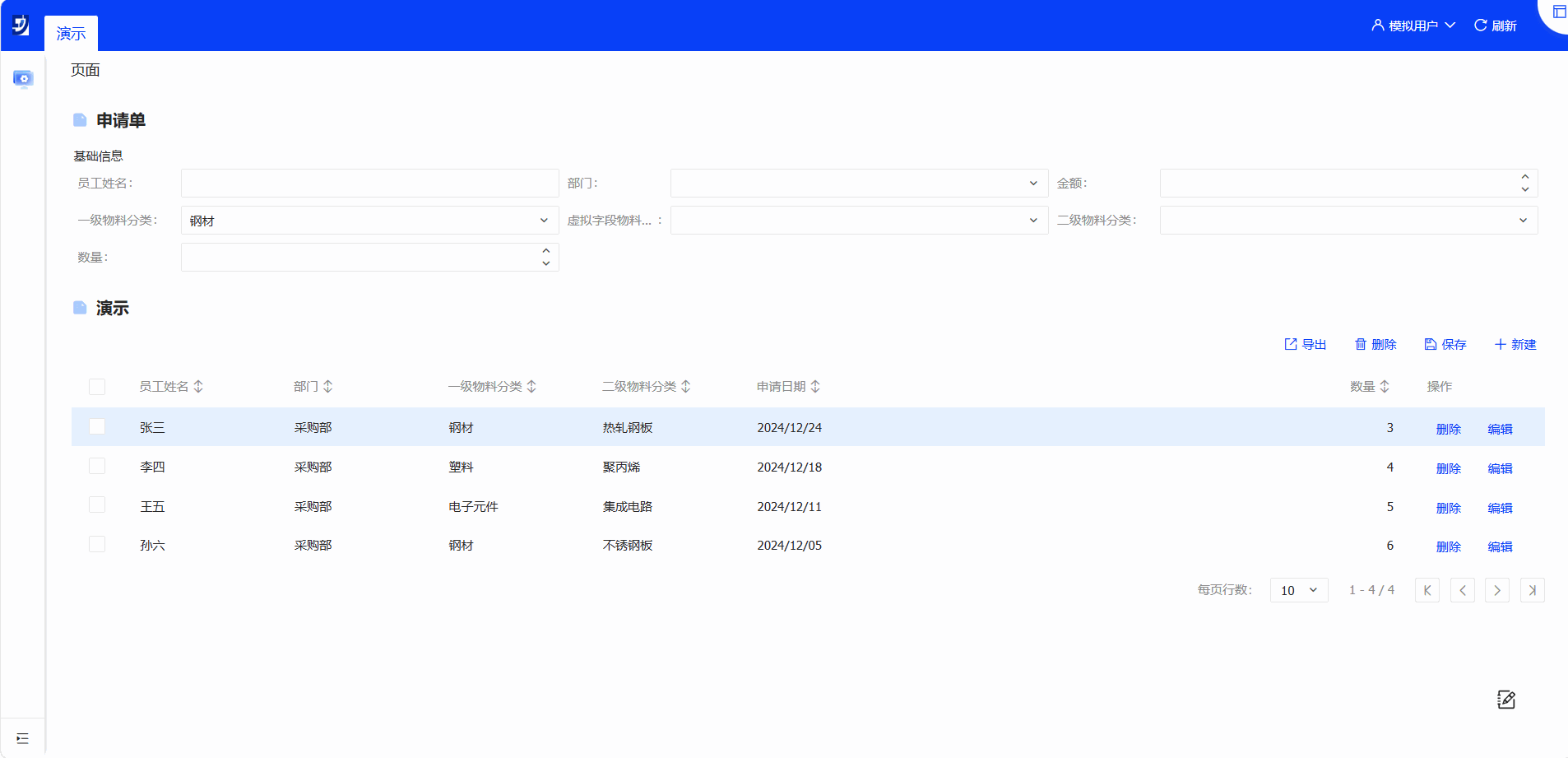 在页面设计时使用此业务对象,预览时我们可以看到一级物料分类和二级物料分类中选项的级联效果,选择不同的一级物料对应不同的二级物料,如果先选择二级物料还会自动带出对应的一级物料。