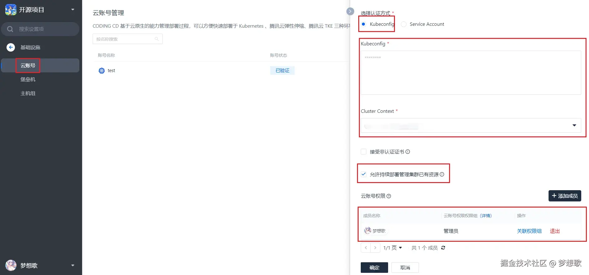在 CODING 的 持续部署 > 弹性伸缩 > 配置云账号 添加 K8s 凭据,绑定需要部署的 K8s 集群。