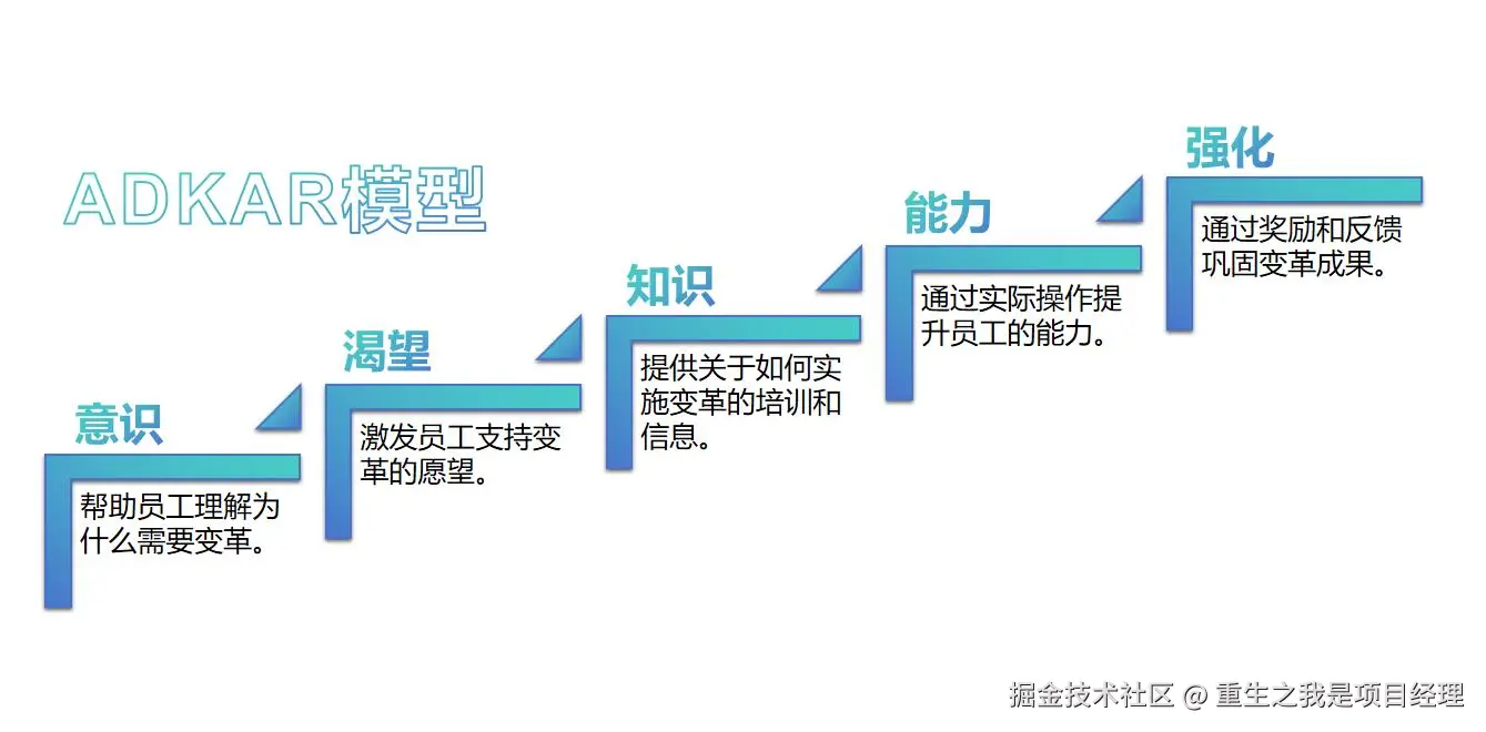 ADKAR模型侧重于个人层面的变革,强调在变革过程中对个体的关注。ADKAR代表了五个关键步骤:意识(Awareness)、渴望(Desire)、知识(Knowledge)、能力(Ability)和强化(Reinforcement)。