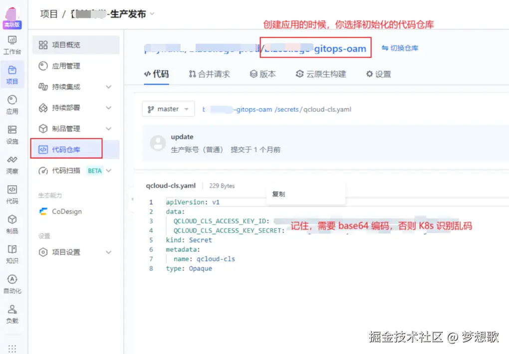 配置管理不支持在界面添加 Secret,建议在代码仓库新建文件,里面的内容通过 base64 编码保存。