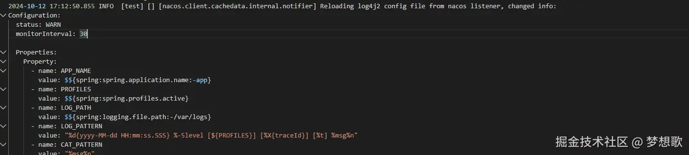 在 Nacos 修改 log4j.yml 发布后,可以从应用日志看到 Reloading log4j2 config file from nacos listener, changed info,表示日志已经重新加载。