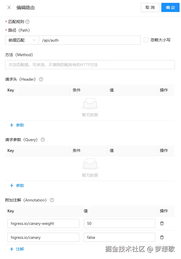 首先,保留上述配置的路由 A ,当请求不携带任何 Header、Cookies 时,默认请求到这个路由。