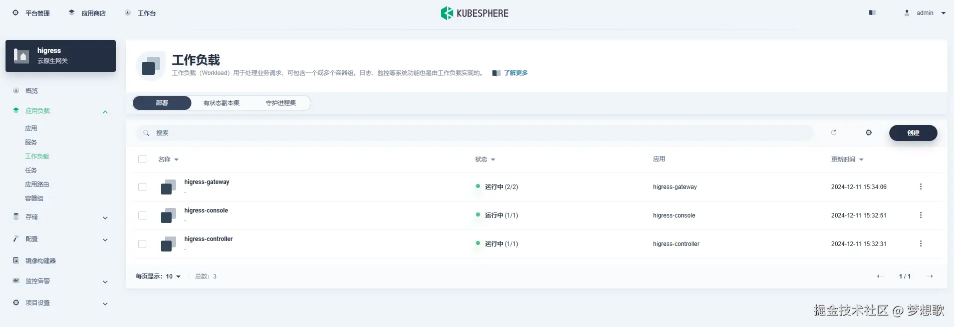 在 KubeSphere 查看已部署的工作负载,可以看到 Higress 分别创建了 higress-gateway 访问入口、higress-console 控制台和 higress-controller 控制器。