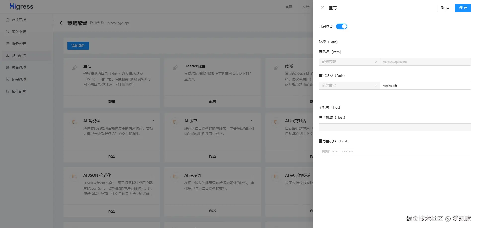 如果实际的请求入口为 /demo/api/auth,期望后端请求到 /api/auth,则需要设置重写策略。