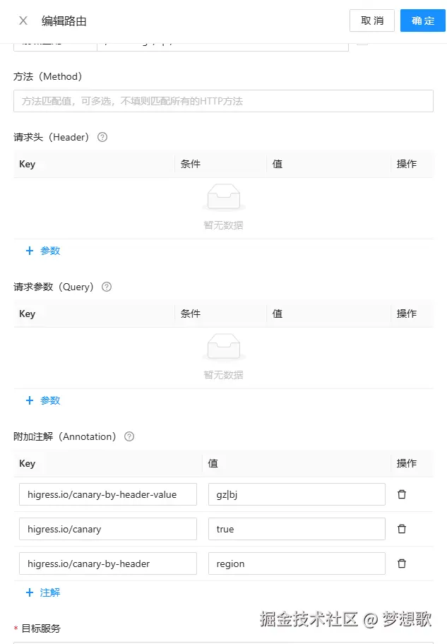 添加一个新的路由 B,使用 higress.io/canary-by-header 来控制。如下图,我们配置了 higress.io/canary-by-header=region 和 higress.io/canary-by-header-value=gz|bj,当客户端在 HTTP 请求头中携带 region 参数值 gz 或 bj 时,将请求路由到路由 B,否则路由到原来的路由 A。