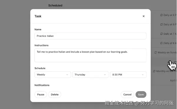 要使用这个新功能,用户只需在 ChatGPT 的模型选择器中选择 “4o with scheduled tasks”,然后输入他们希望 ChatGPT 完成的任务及时间。系统还可以根据用户的对话主动建议任务,但用户必须明确批准这些建议才能创建任务。所有任务都可以在聊天线程中直接管理,或通过新推出的任务部分(仅在网页端可用)进行修改或取消。此外,任务完成后,用户将通过网页、桌面和移动端收到通知。目前,每个用户最多可以同时设置10个活跃任务。