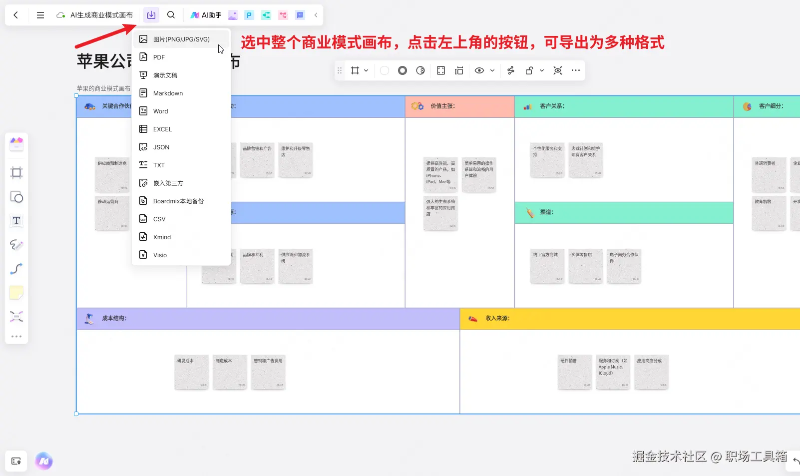 保存与分享:基于boardmix生成的商业模式画布,可以导出保存为多种格式(如PDF、PNG、SVG等),方便后续的分享和展示。