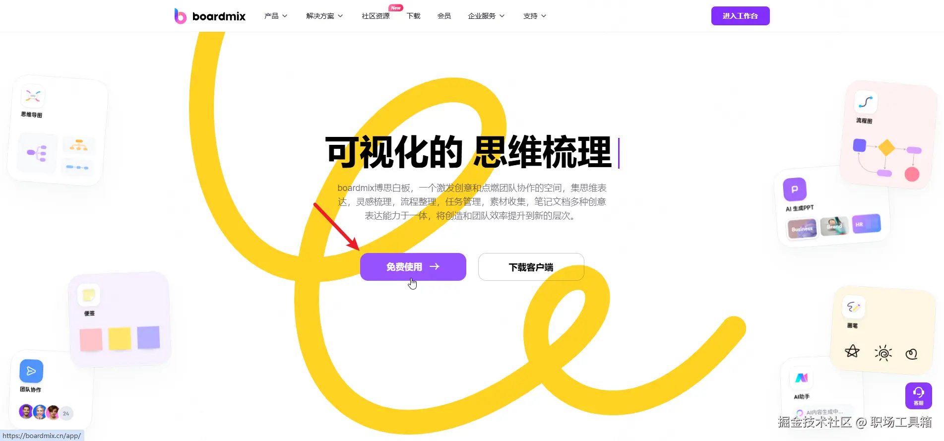 运行boardmix:在浏览器访问boardmix首页,如下图,点击“免费使用”,进入boardmix工作台。