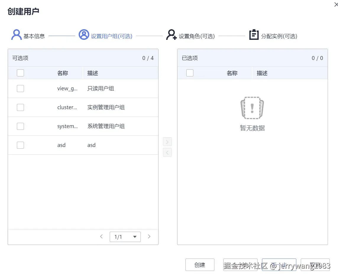可直接创建用户,也可在设置用户组、角色、分配实例后再创建用户。