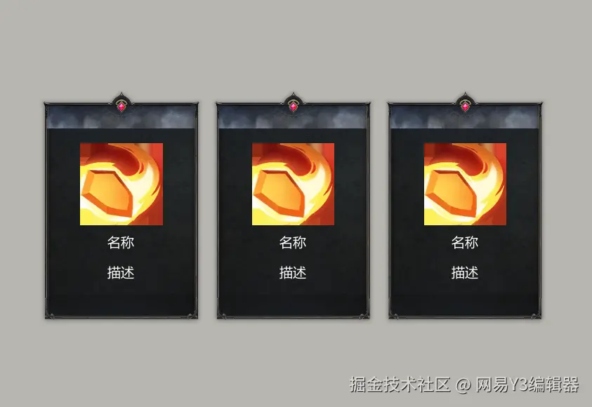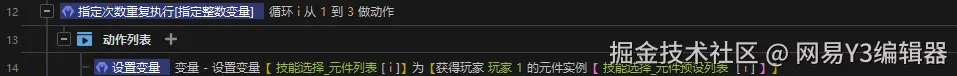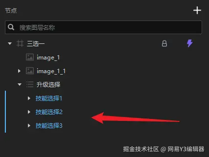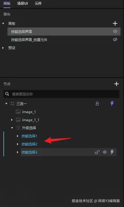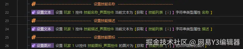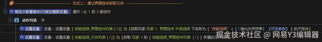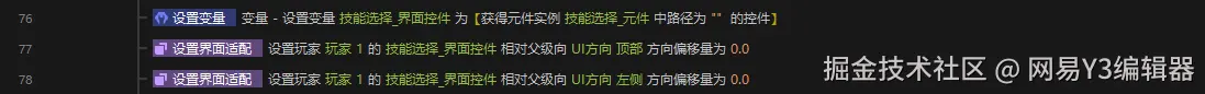 接下来,我们需要设置三个技能选择框【自定义元件】的文本,图标信息以及事件响应。我们需要用获取【元件】进行相关设置。