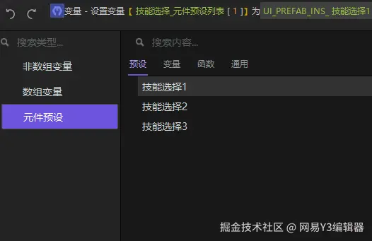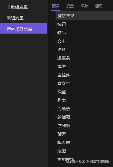 Y3中界面模块相关变量类型共有五种:元件、元件类型、元件预设、界面控件、界面控件类型