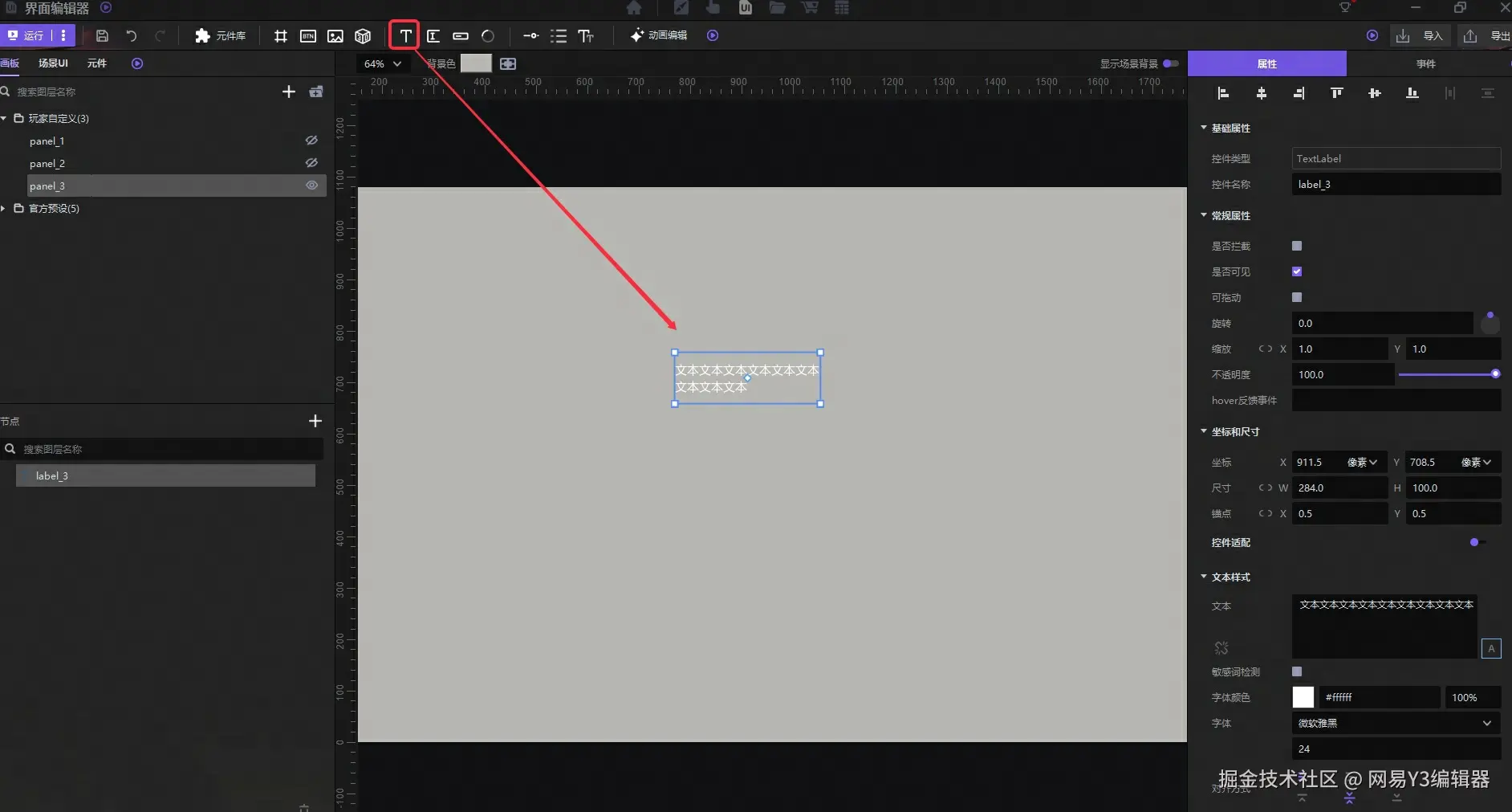打开界面编辑器,从上方控件栏拖拽文本控件放置在画布中。或者在左下方节点处右键新建控件-文本控件