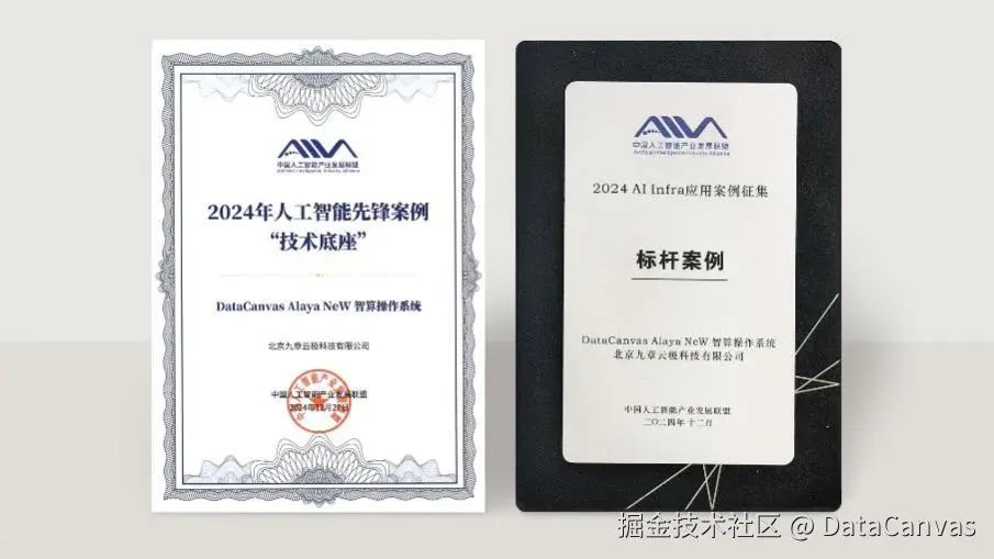 会上,中国人工智能产业发展联盟AI Infra工作组正式发布2024 AIIA先锋案例 AI Infra专项标杆案例,凭借高价值、标杆性、强落地的应用经验,DataCanvas Alaya NeW 智算操作系统成功入选 “2024 AI Infra 应用案例征集标杆案例”“2024年人工智能先锋案例-技术底座” 两大典型案例。